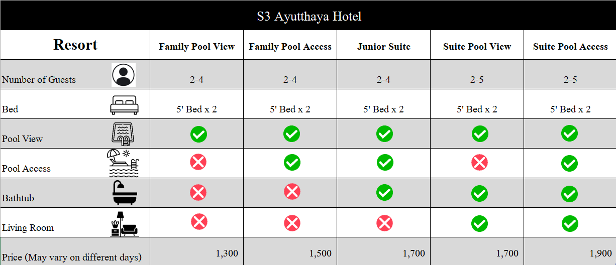 | Extra charges for Late Checkout: | 12 p.m. - 2 p.m. | 200 Baht |